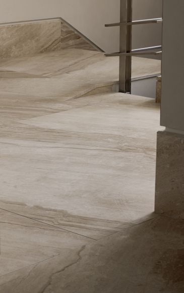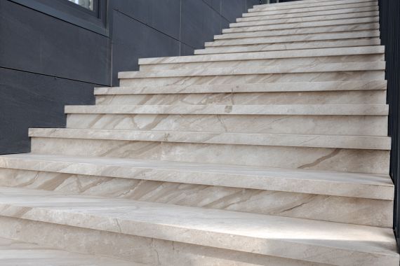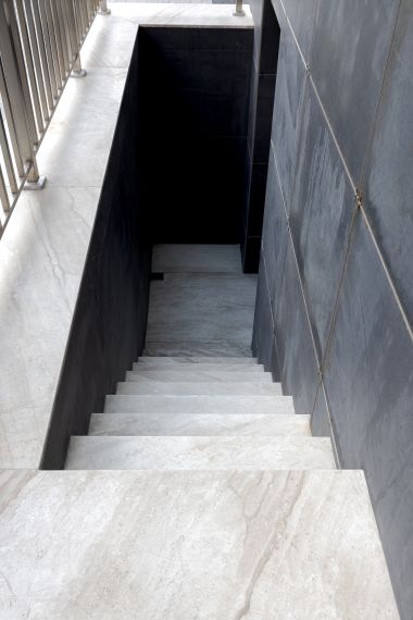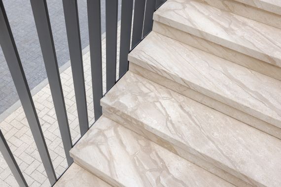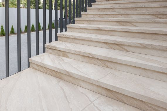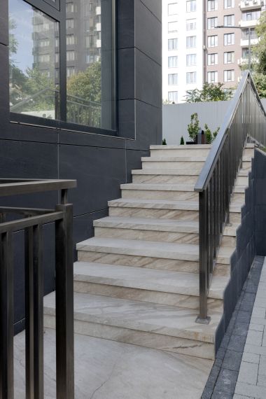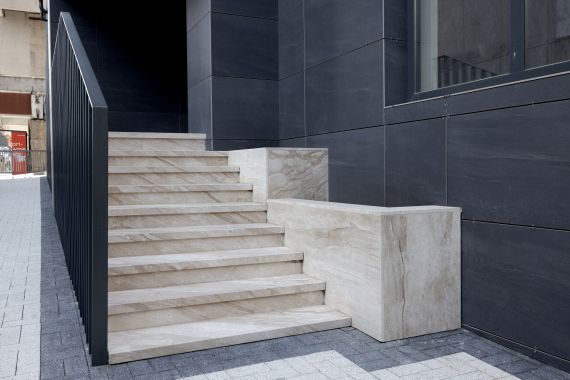 The exterior elements — entrance stairs, parapets, and access platforms — mirror the same design approach, using the Daino Imperiale marble in a matte finish, ideal for durability and everyday use.