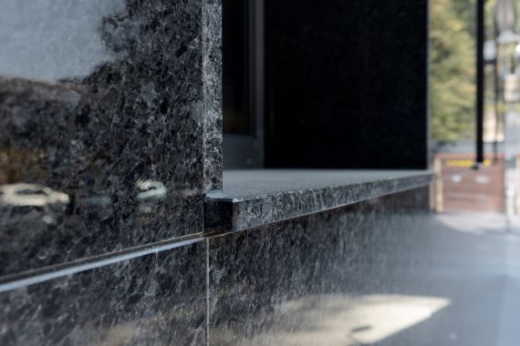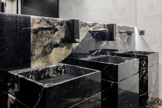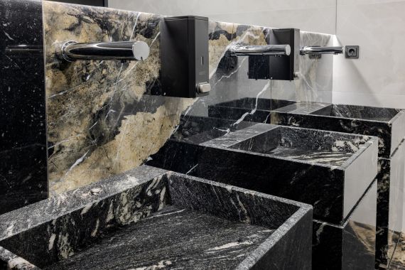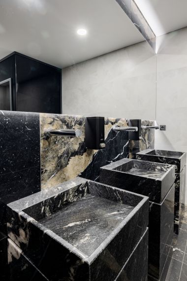 The interior columns are clad in Vulcano Granite, while the freestanding sinks in the restrooms are crafted from Black Forest Granite, carved from solid blocks with seamless joints and meticulous detailing.