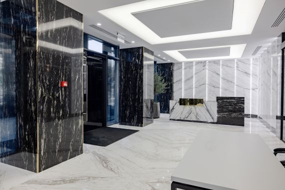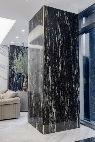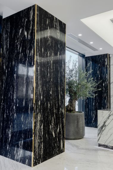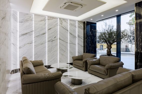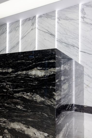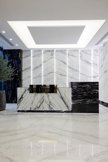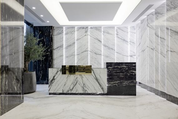 The reception area features a refined combination of Statuario Marble and Vulcano Granite, creating a perfect dialogue between pure white and deep black tones.