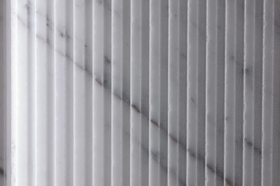 The surrounding walls are covered in Statuario Marble with a special linear cut 2x2 mm finish, producing a subtle play of depth and light enhanced by architectural illumination.