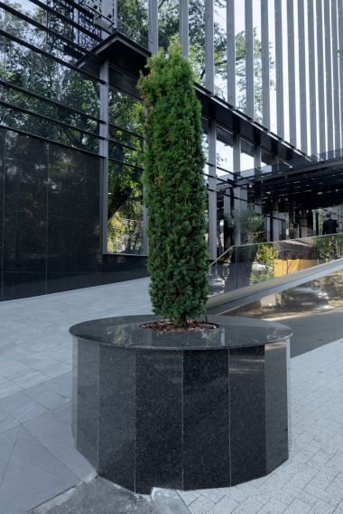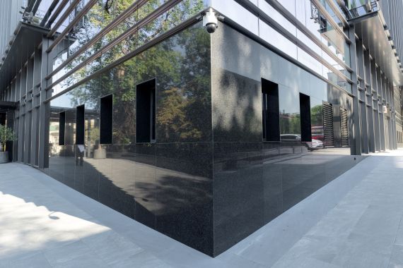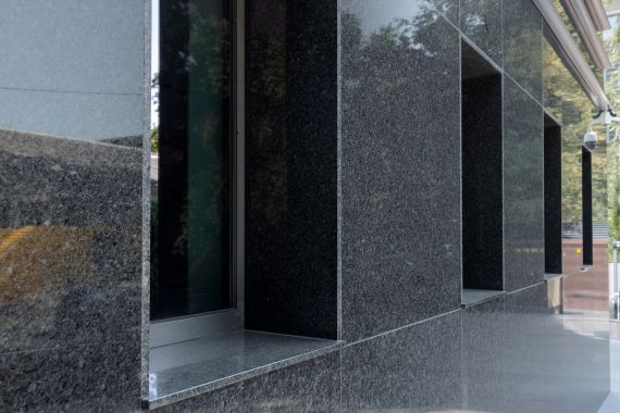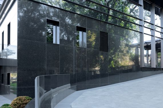 For the exterior, ArtGranit executed a complete ventilated façade, as well as stairs, access platforms, parapets, and planters, all clad in Negro Angola Granite – a material prized for its metallic reflections, fine crystalline texture, and exceptional weather resistance.